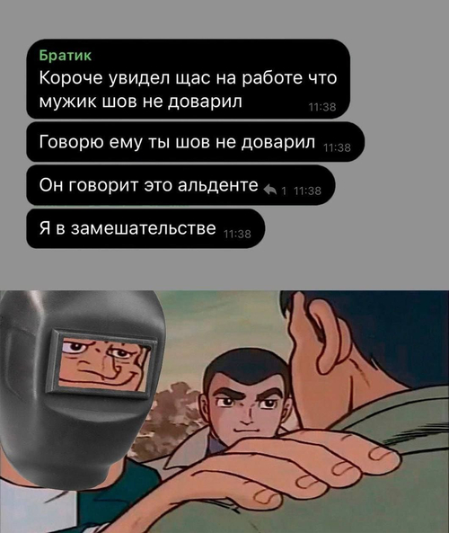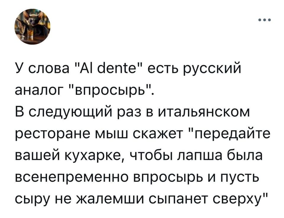 130 0 Впросырь 0 Жизненное | Иностранцы 20.03.2025 Альденте, Впросырь, Al dente 🖼️ Текст на изображении (раскрыть) ▼ У слова «Al dente» есть русский аналог «Впросырь». В следующий раз в итальянском ресторане мыш скажет «передайте вашей кухарке, чтобы лапша была всенепременно впросырь и пусть сыру не жалемши сыпанет сверху». Комментарии к анекдоту: Лучший комментарий ⚡ 20.03.2025 00:00 # Альденте и в просырь нужно, чтобы отваренные макароны или лапшу дотушивать с соусом. Добавить комментарий 🤣 😂 😊 🥰 😎 🤔 😢 ❤️ 👍 👎 💯 Код: Отмена Отправить Похожие материалы: 591 0 Недоварил 0 Мысли 91 0 Шов альденте 1 Профессиональное 377 0 Al dente 0 Жизненное 269 0 Доширак Al dente 0 Бобры 1604 0 Доширак Сегодня буду готовить себе доширак, доведенный до стадии al dente, и подам я его себе под соусом майонез. 7 Анекдоты 280 1 Доширак Бывает, чуть-чуть передержишь — и всё, "Доширак" уже не альденте. 1 Мысли 227 0 Аль денте Для меня макароны аль денте — это когда я хочу есть и уже не особо важно, готовы они там или нет. 0 Мысли Лексика 288 0 Настоящий Стейк 0 Мужчины 310 0 После отчисления 0 Профессиональное 642 0 Недоношенные дети в Италии — Как в Италии называют недоношенных детей? — Альденте. 1 Италия 466 0 Воскресный ужин в итальянском стиле 1 Жизненное Загрузка материалов...