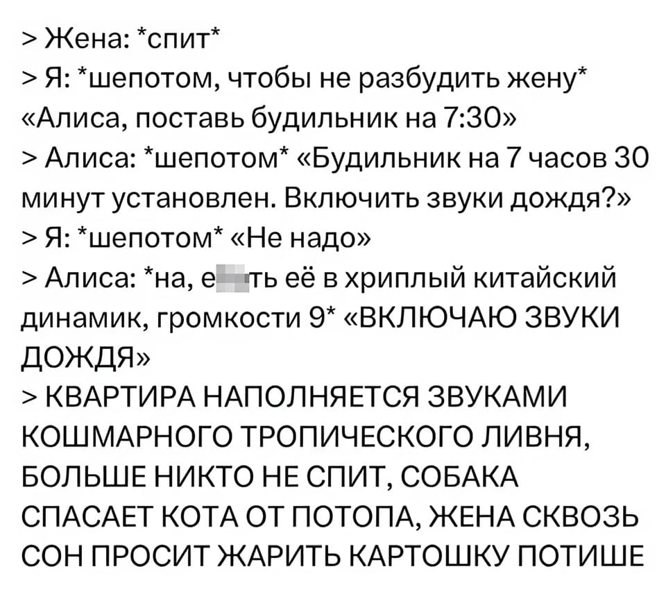 — Вот говорят, что мужчины умнее женщин. А у нас с тобой: я лучше училась в школе и в университете, у меня выше IQ, я больше зарабатываю... Что скажешь?