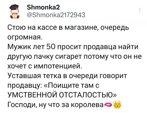 И она рассказала такую вот историю: «Иду я, значит, курю. Тут мне на встречу вылетает тётка и спрашивает, что же вы курите, в таком-то возрасте?. Я, говорит, сначала опешила от такого, я что, ребёнок что ли какой? А потом как отчеканила "Копчёное мясо дольше хранится"».