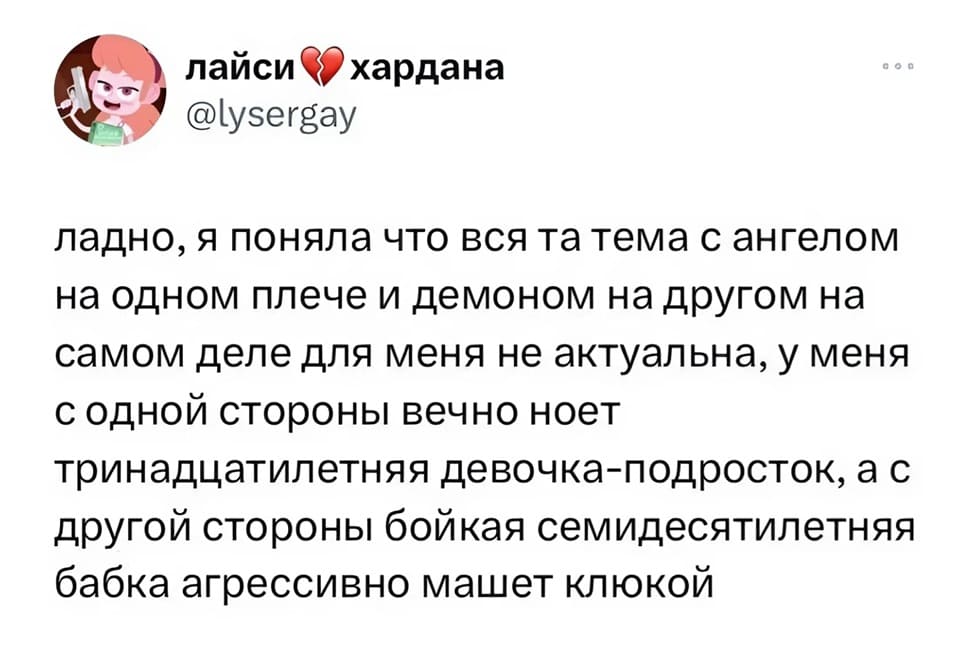 — Дорогая, если у тебя и вырастут крылья за спиной… то скорее всего эти крылья будут чёрного цветы и при этом ты будешь каркать…