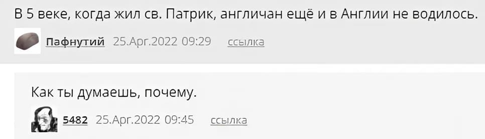 Мой дедушка, родом из Ирландии, но по воле судьбы оказался в Англии. В тот момент, когда мои родители поехали с ним в Ирландию, где он не был уже 25 лет, первое, что он сделал, так это решил навестить свой любимый паб и повёл туда моих родителей. Когда они зашли в заведение, первое, что сказал парень стоявший за барной стойкой, так это: