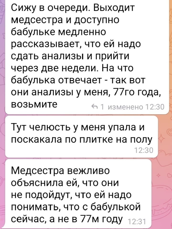 — Доча, – ответила старушка, — в моё время всё было. Я китайский преподаю, вот и пытаюсь понять, почему у тебя на шее написано «повторно не замораживать».