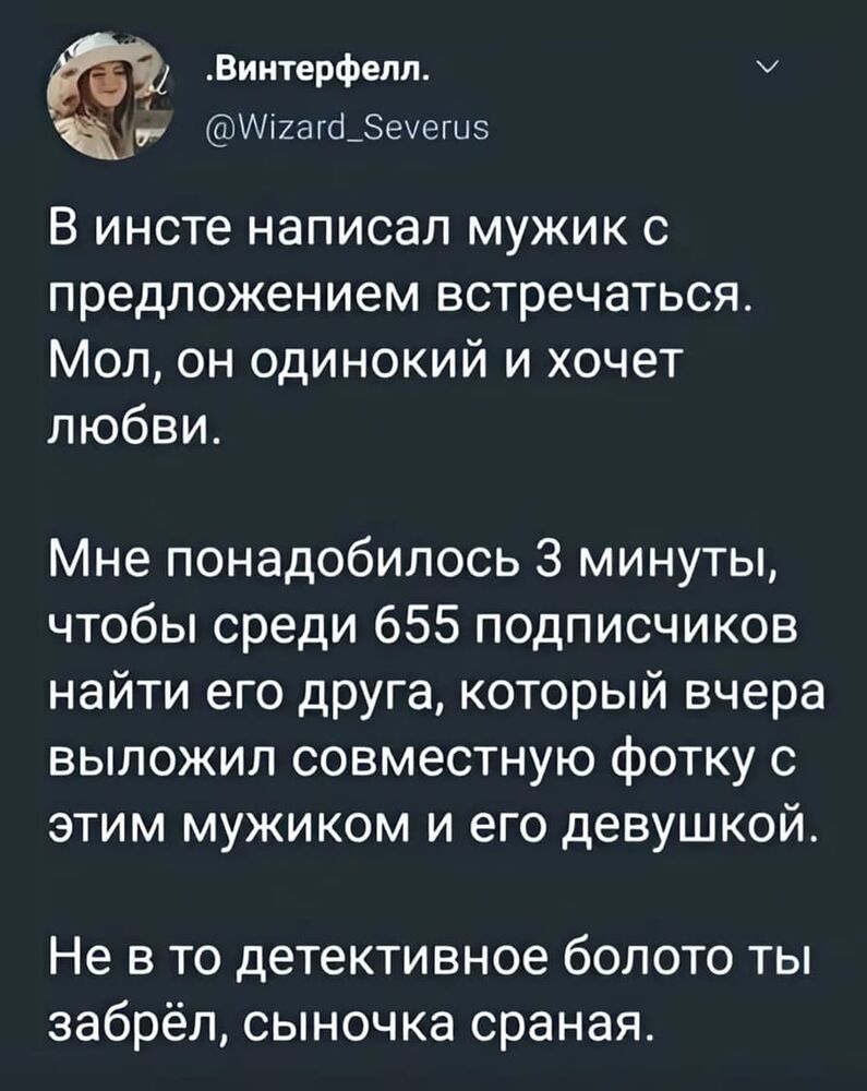 Если ты не понравился женщине, она скажет, что у неё есть мужчина, даже если его у неё нет. А если понравился, скажет, что его нет, даже если он есть...