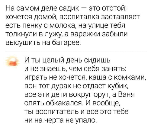 Прогулка в детском саду. Зима. Один из мальчишек громко заявляет: «А папа сказал, что у умных язык к железу не прилипает!» И мы дружно всей группой лизнули: кто — железную горку, кто — перила... Не помню, сразу ли пришло осознание, или когда язык зажил, или ещё позже. Но теперь я точно знаю: у умных, да, не прилипает.