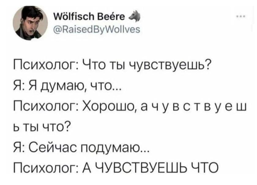 – Был у меня опыт общения с психологом женщиной. Ведёт себя как женщина, но мы с ней больше трхались, чем общались.