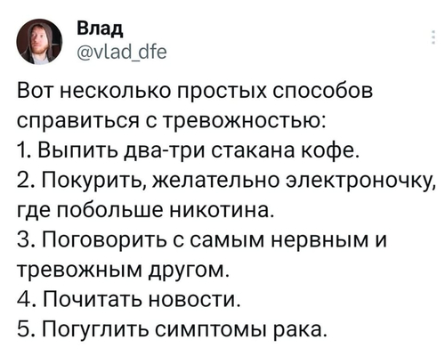 Девочка знакомая всё время с утра вопросом мучилась: выключила она утюг или нет? Металась, мужу звонила, даже домой украдкой ездила... Свела её со знакомым психиатром. Звоню – мол, как пообщались? Отлично, говорит. Выписал таблетки и дал хороший совет. Я больше вопросов из деликатности не задаю. Доктор опытный, лекарство несерьёзное – вроде бы всё в порядке, лёгкий стресс... А надо сказать, сослуживцы этой девочки уже привыкли по утрам устраивать лёгкий глум на предмет "А выключила ли ты утюг? Уверена? Точно уверена?". И дальше любуются как она на стены лезет... Следующий день после визита к психиатру (с её слов). После планёрки один мужик подходит и заботливо интересуется – выключила ли она утюг.