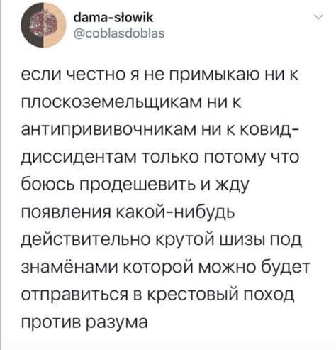 Признаться честно, я не примыкаю ни к плоскоземельщикам, ни к антипрививочникам, ни к ковид-диссидентам только потому, что боюсь продешевить и жду появления какой-нибудь действительно крутой шизы, под знамёнами которой, можно будет отправиться в крестовый поход против разума.