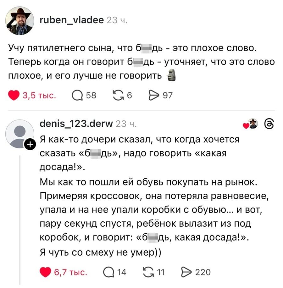 — Антон, мы с тобой уже совсем взрослые мужики и пора бы нам уже начать ругаться матом, как все взрослые. Сегодня за завтраком, я скажу слово "БЛ#ДЬ", а ты скажешь слово "НАХ#Й". Идёт?