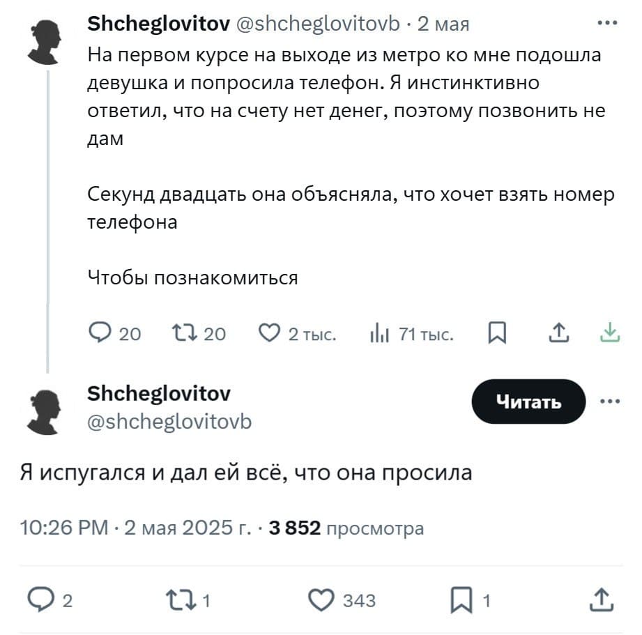 На улице, у незнакомой мне и крайне симпатичной девушки, из кармана выпала денежная купюра достоинством в 1000 рублей, я поднял купюру и проследовал за девушкой, с целью вернуть ей её деньги. Подхожу к ней, улыбаюсь и говорю "Привет", она посмотрела на меня с недовольной физиономией и говорит: "Вообще-то, у меня парень есть". Я постоял рядом с ней, подумал и пришёл к выводу, что лишняя тысяча - лишней не будет.