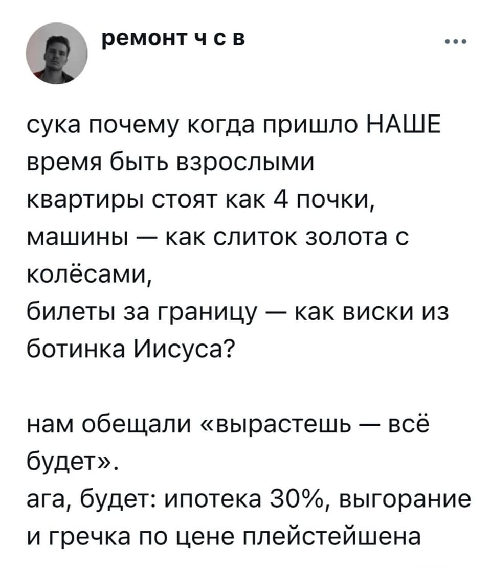 - Эх, ну вот что за времена такие настали? Никогда бы не подумал, что доживу до такого. Жить стало дорого и невыносимо, а умирать ещё дороже и соответственно вовсе непозволительно!!!