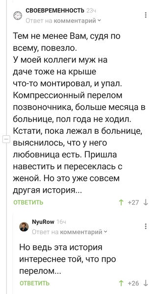 — Минуточку, – отвечает дежурная медсестра, — я посмотрю в его карточке... вот, нашла, перелом хорошо срастается, послезавтра снимем гипс, а в пятницу снимем швы.