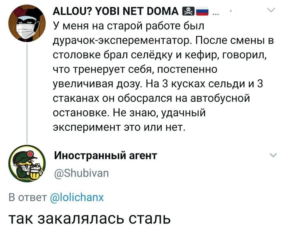 — В молодости самогон запивали водой из под колонок, пока шли на дискотеку и закусывали сорванными зелёными яблоками.