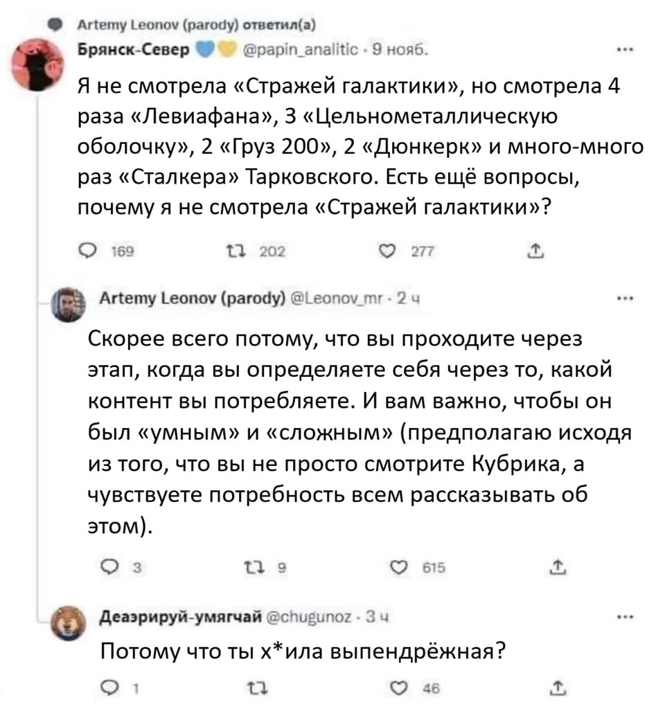 — Культовый фильм середины девяностых. Так как я проживаю в городе Химки, то одна из цитат данного фильма, мне особенно любима и близка.