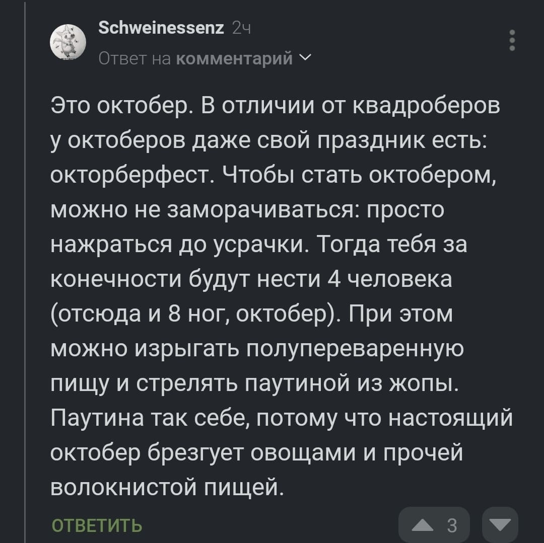 Это октобер. В отличии от квадроберов у октоберов даже свой праздник есть: окторберфест. Чтобы стать октобером, можно не заморачиваться: просто нажраться до усрачки. Тогда тебя за конечности будут нести 4 человека (отсюда и 8 ног, октобер). При этом можно изрыгать полупереваренную пищу и стрелять паутиной из жопы. Паутина так себе, потому что настоящий октобер брезгует овощами и прочей волокнистой пищей.
