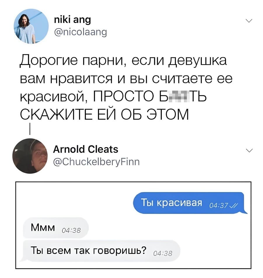 — Я хотел написать тебе о том, какая ты красивая девушка, но красота, она ведь внутри, а внутри тебя я ещё не был.