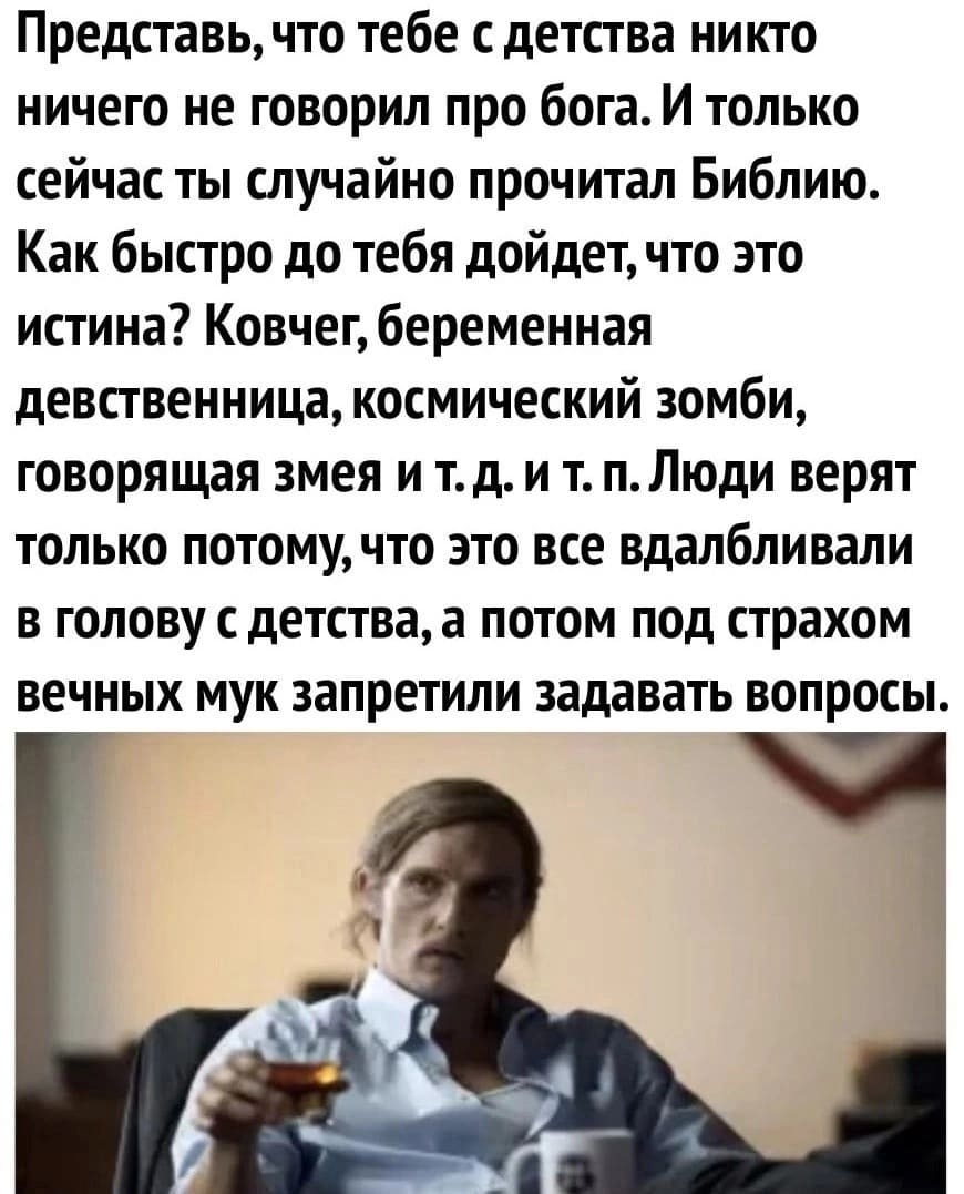 — Сын мой, ты нашёл Господа Иисуса Христа? – и кунает его башкой в холодную воду.