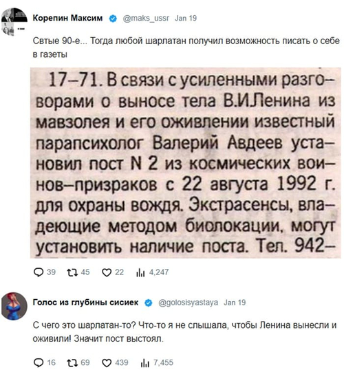— Представьте себе, видел. И вы даже не поверите. Стою я в очереди, вдруг подходит человек в штатском, отводит меня в сторону и говорит, что их учёные только что совершили чудо и смогли оживить Ленина, и что он хочет поговорить с кем-нибудь из толпы. И они выбрали меня для этой цели.