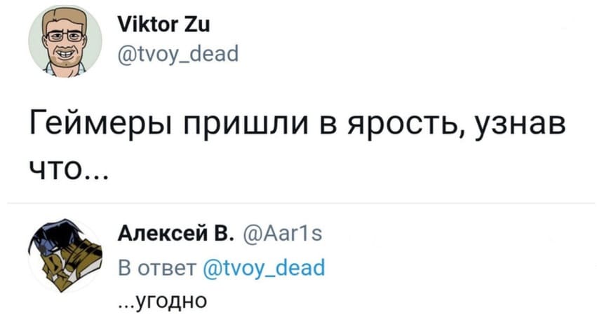 Тот попал в ад. Смотрит: вокруг темновато, черти, котлы. Он отбирает у ближайшего чёрта вилы, уничтожает всех чертей, добирается к Сатане, его убивает. Бог видит, что творится и думает: «А он-то хороший!». И спустил геймеру лестницу. Тот поднимается и видит: ангелы, светло, хорошо.