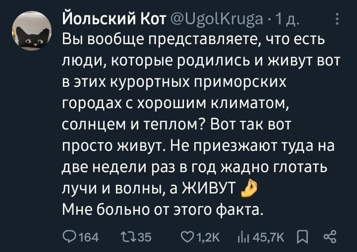 — Все летом едут в отпуск на море, а нам и поехать некуда! Мы тут живём!