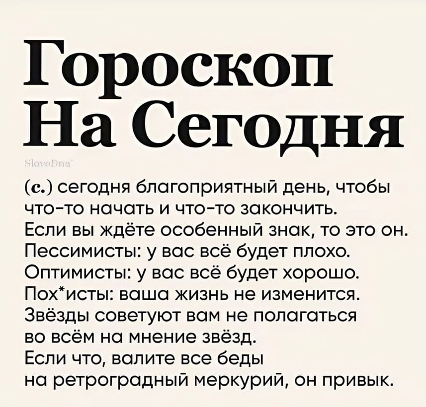 Если вы прочитали гороскоп на сегодня и он не сулит вам ничего хорошего на этот день, просто поищите другой: в интернете их полно, причём на любой вкус!