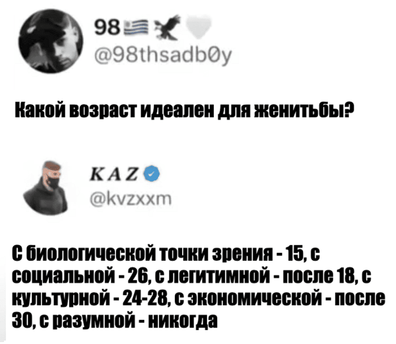 — Ну что же, парни, мне кажется я начала понимать, почему вы женитесь в 18. Возможно это как-то связано с тем, что в 28 на свидания просто не остаётся ни времени, ни сил.
