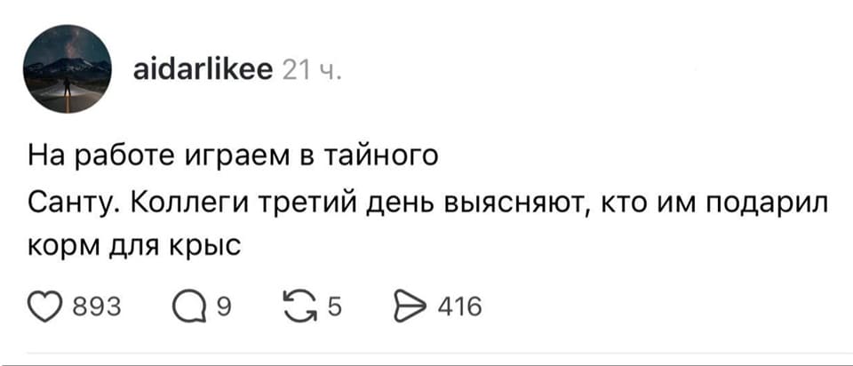 В офисе играли в тайного Санту и девки уже третий день выясняют кто им подарил корм для крыс.