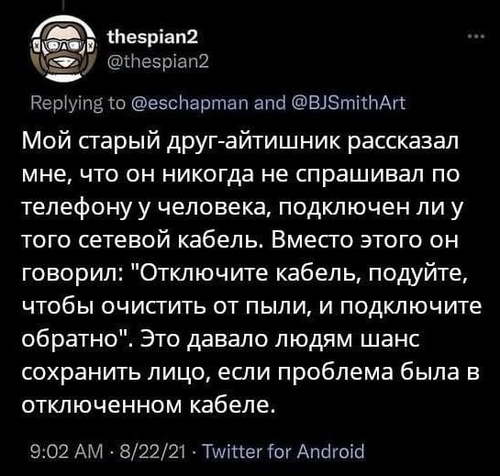 Сидит молодой айтишник перед неработающим компьютером и за голову держится. Подходит опытный: