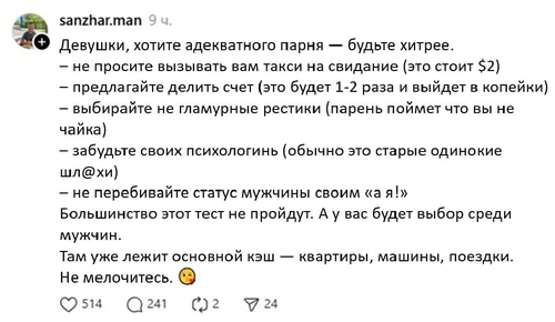 Только подкаблучник будет спрашивать у жены, можно ли пойти на рыбалку. Настоящий мужик и так знает, что нельзя.