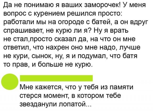 — Да это вовсе не я молодец, а просто батя однажды нашёл мои сигареты и заставил выкурить пачку.