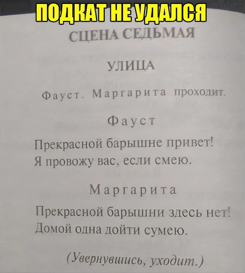 Очень воспитанный и крайне интеллигентный парень, решил начать знакомиться с девушками, и для этого он начал заниматься пикапом. Прошёл кучу разных пикап-тренингов и семинаров по НЛП. В итоге его там накрутили и дали понять, что с девушками нужно разговаривать в утвердительной форме и по-строже. Первый подход, он сильно волнуется и никак не может в голове сформулировать обращение к понравившейся ему девушке. В итоге набирается мужества, включает бредогенератор и кое-как решается на подход. Подходит к девушке и говорит: