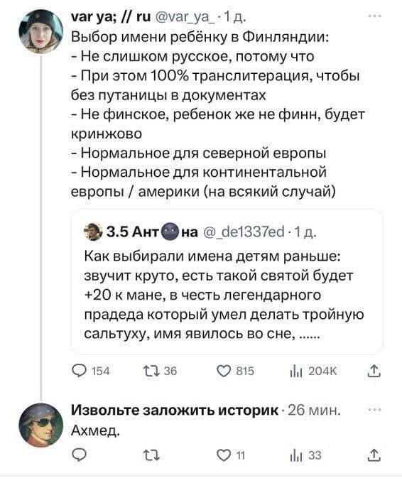 — А представляете, если бы фамилии нам давали, как у индейцев – по принципу личных качеств и достоинств? Вот, к примеру, знакомишься ты с человеком, и сразу понятно, кто перед тобой — Работяга Алексей или П*здабол Артём.