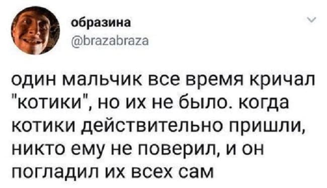 Один мальчик всё время кричал «котики», но их не было. Когда котики действительно пришли, никто ему не поверил, и он погладил их всех сам.