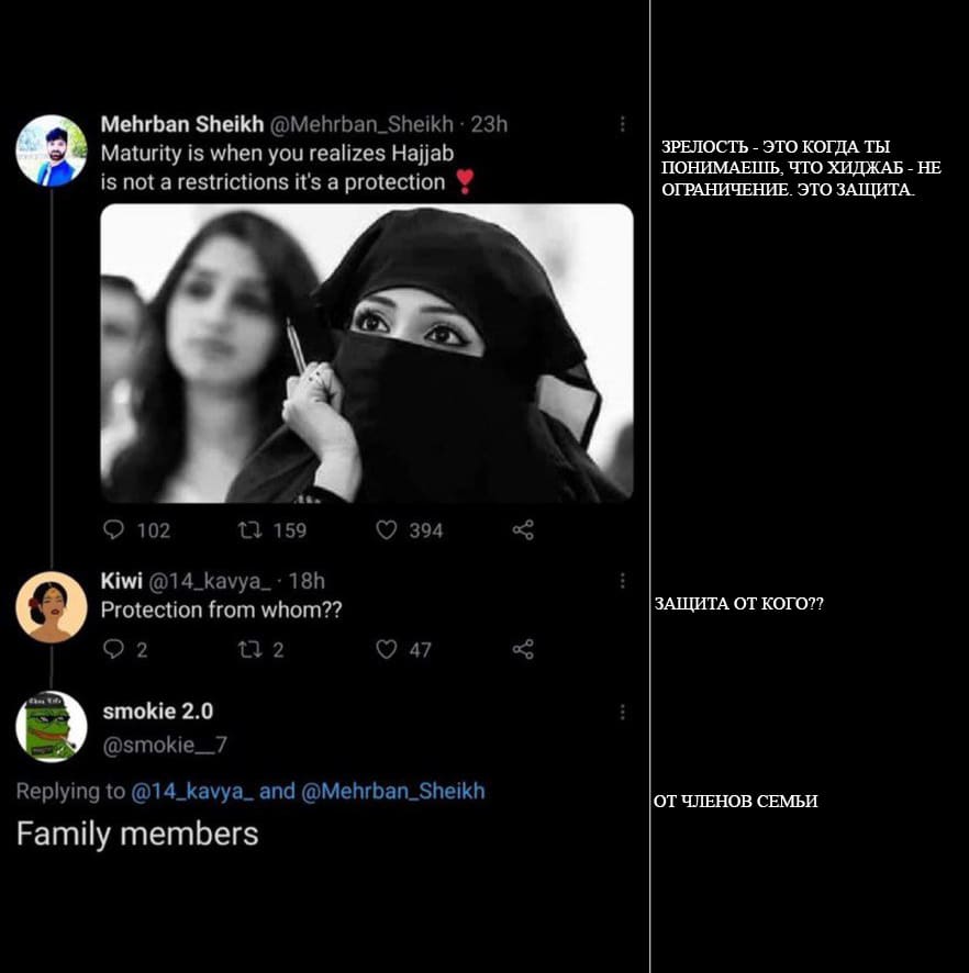 — Слушай, вот никак не могу понять, зачем вашим женщинам эта ткань на голове – паранджа, хиджаб, никаб или как там её?... Лица же не видно совсем, дышать невозможно, есть сложно... Ну зачем?