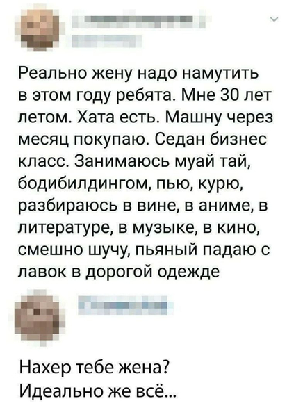 Вот почему так? Смотришь на других: все вокруг встречаются друг с другом, мутят с кем-то. А мне уже 29 и уже шесть лет у меня нет девушки. Вроде и не урод, чувство юмора есть и зарабатываю неплохо, машина есть, квартира, а девушки нет. Спросил жену, что она думает по этому поводу. Она тоже не знает...