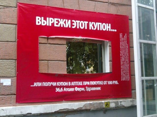 Вывеска на витрине, которая расположена при входе в небольшой магазинчик.