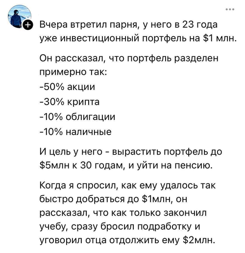 — Первый: можно ли мне получать побольше денег на карманные расходы? Второй: почему нет?