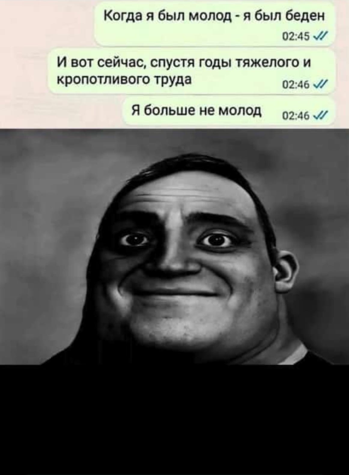 — Знаешь, раньше у нас был маленький дом, чёрно-белый телевизор и тесный скрипучий диван. Но я засыпал с прелестной девятнадцатилетней женой. А сейчас?! Дом большой, телевизор на полстены и кровать на полспальни, но тебе уже, подумать только, шестьдесят девять!