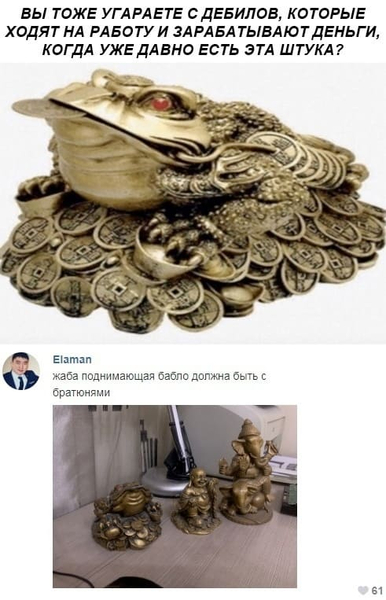— Во, я так и делаю, со своей огромной зарплатой, вкладываю в недвижимость (плачу за жильё), в пищевую промышленность (покупаю продукты питания), в акции (в магазине по жёлтым ценникам покупаю всё). Я вовсе не нищий, я просто вкладчик.
