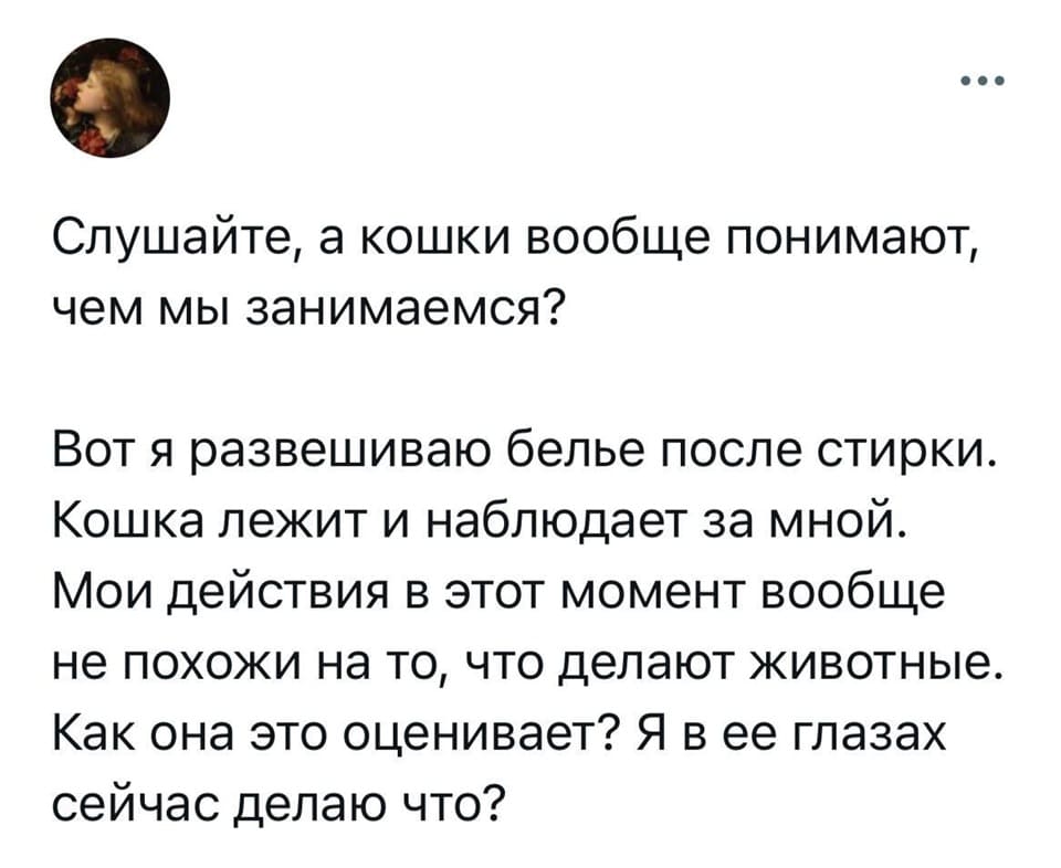 — Что думает ваша кошечка, когда гадит на ковёр в углу за креслом?
