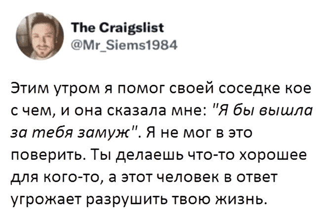 I helped my neighbor out with something this morning and she said to me "I could marry you". I couldn't believe it. You do something nice for someone and they threaten to ruin your life in return.
