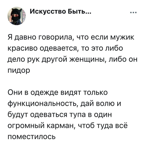 А кто-нибудь вообще понимает что это за мистическое чувство вкуса, про которое все говорят? И почему нельзя одеваться просто по кайфу, а не так чтобы нравилось людям с этим самым чувством вкуса?