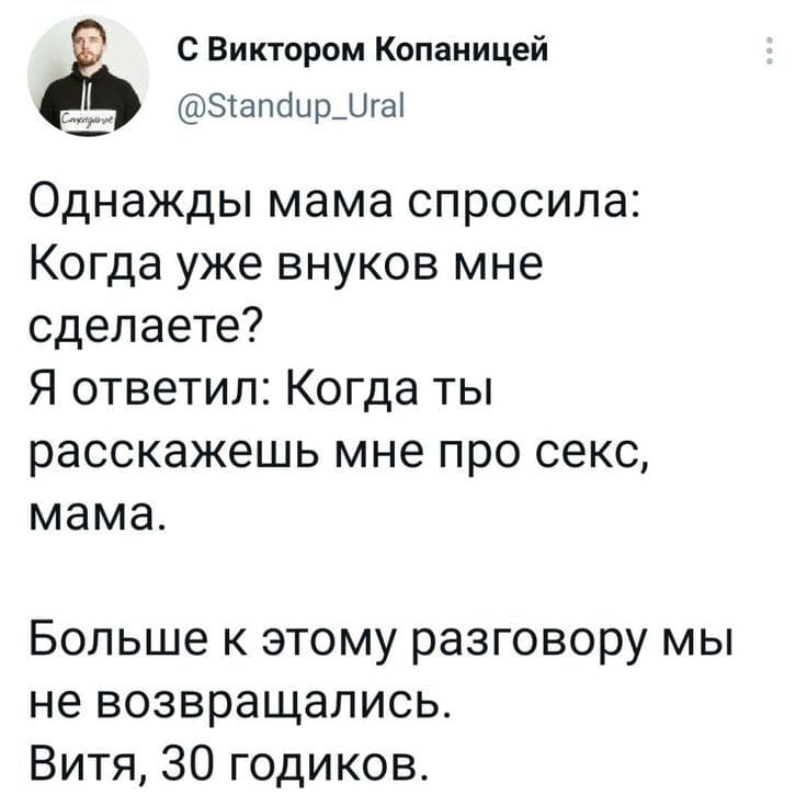 — Сынок, нам с тобой пора начинать говорить о взрослых вещах.