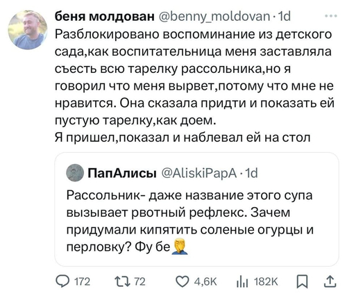 Когда я был совсем ещё мелким ребёнком, я на полном серьёзе думал, что в подвале нашей хрущёвки живут бездомные бомжи. И когда мне, в очередной раз, сильно не хотелось есть мамины щи, то я в тайне от неё выливал содержимое своей тарелки в туалет, имея благие намерения: "Я есть эти щи не хочу, а они там наверное голодные сидят".