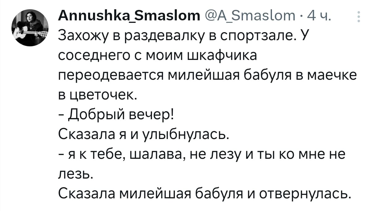 — Ты, бабка, хоть х*й нюхай, а пионер должен быть вежливым!