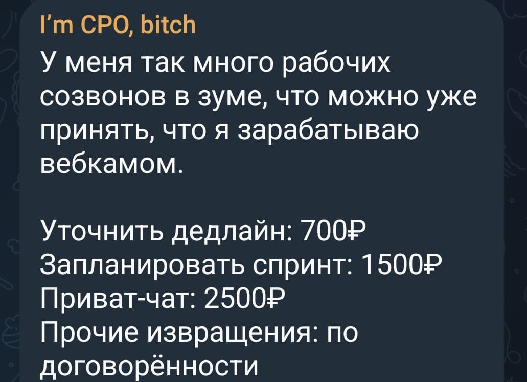 У меня так много рабочих созвонов в зуме, что можно уже принять, что я зарабатываю вебкамом.