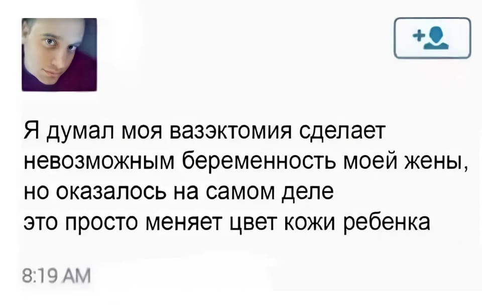 После долгих месяцев безуспешных попыток зачать ребёнка, я узнал, что бесплоден. Когда попытался рассказать эту новость жене, то она перебила меня в самом начале моего повествования, радостным возгласом и я услышал от неё: