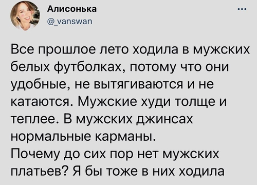 Пока девушки не начнут приводить меня в бар, чтобы напоить за свой счёт и потом развести меня на секс у себя дома, делая мне комплименты, ни о каком равенстве полов не может быть и речи.