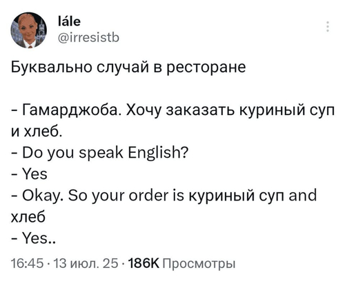 — Не могли бы вы принести мне то, что ест вон та леди за соседним столом?