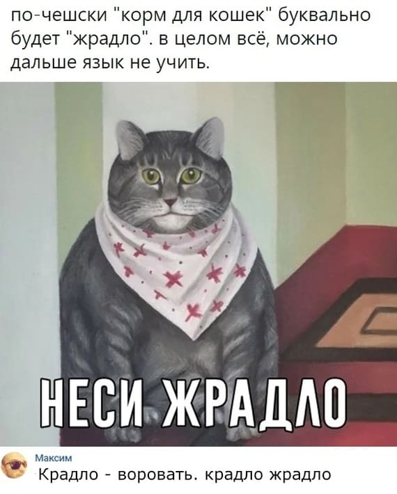— Я вчера кота курицей покормила, он прям радовался. Даже спать ко мне пришёл.