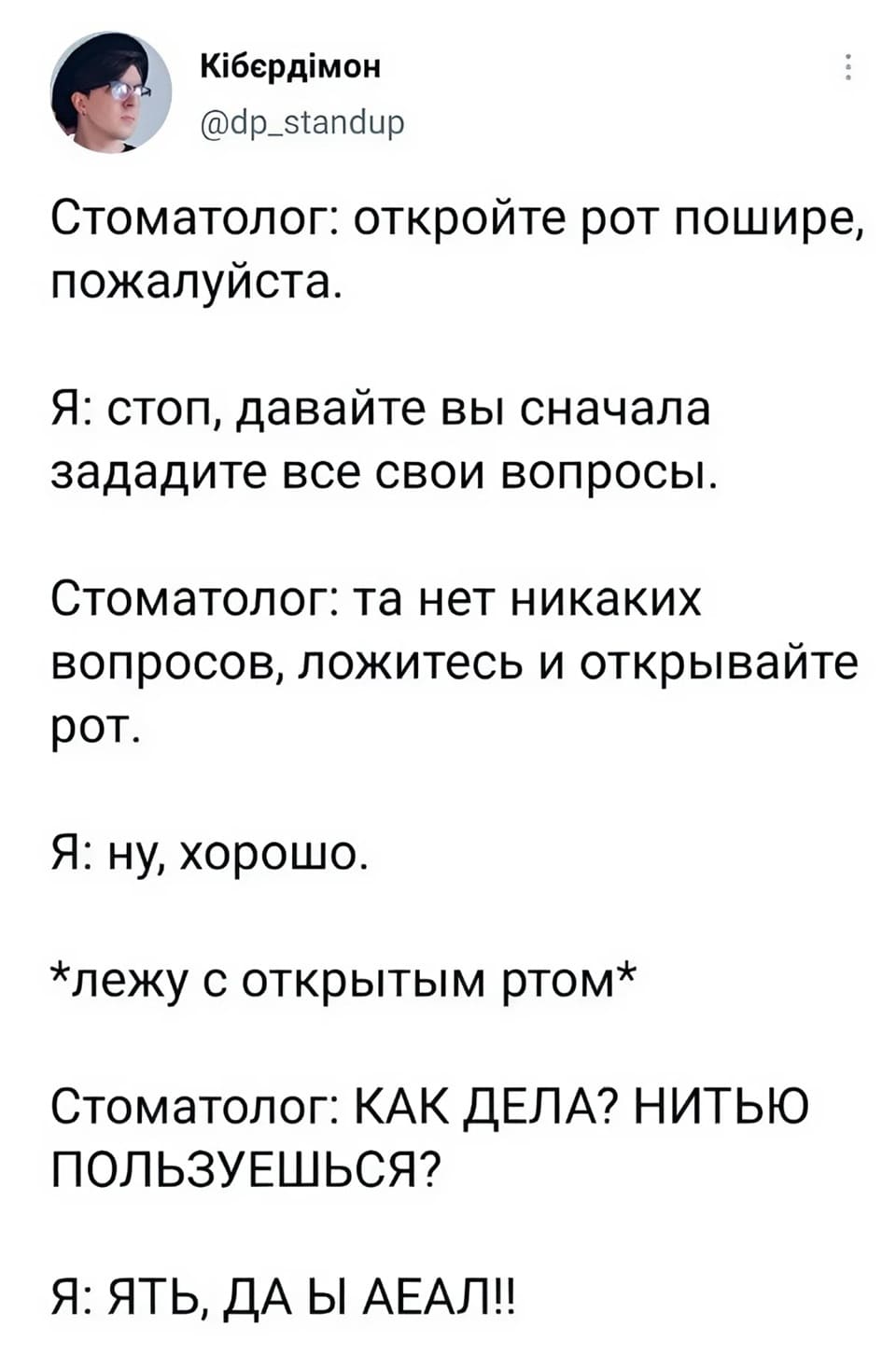 — Нет, просто я работаю дантистом. — Отвечает парень.